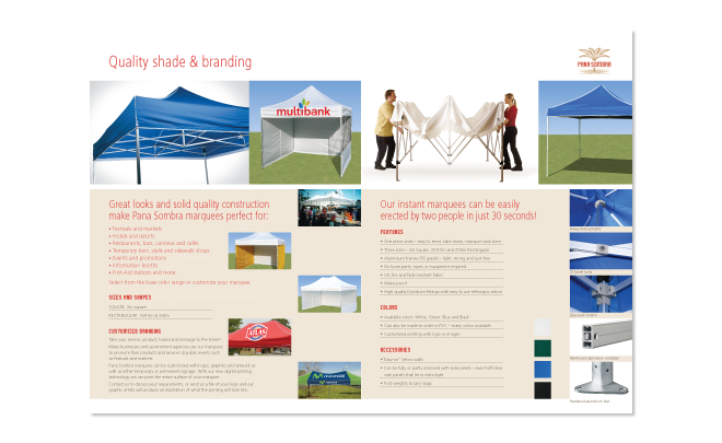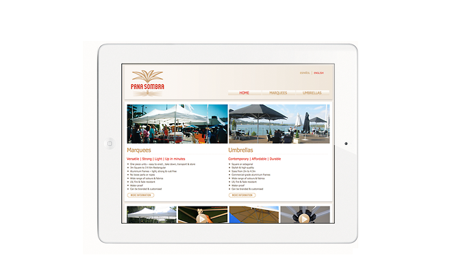 Pana Sombra sells and hires marquees and umbrellas that can be custom printed. Developed for the Panama market, the identity symbolises a palm tree as it casts its shadow.